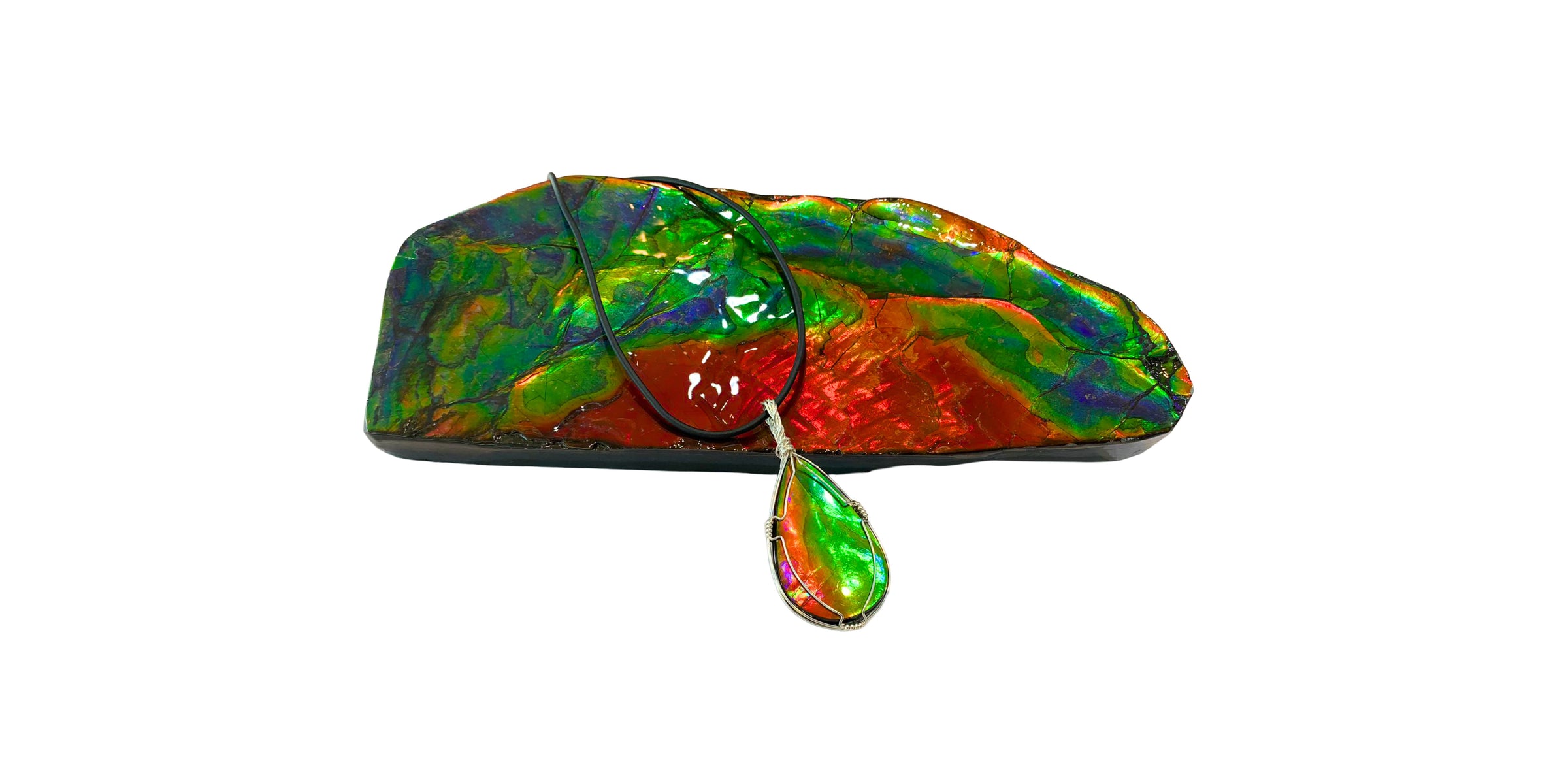This brand-new, limited capsule collection celebrates the beauty of Ammolite through one-of-a-kind craftsmanship. Each pendant is individually hand-wrapped in sterling silver to showcase the natural brilliance of its stone. Explore the collection below and discover the pendant that speaks to you before it’s gone.