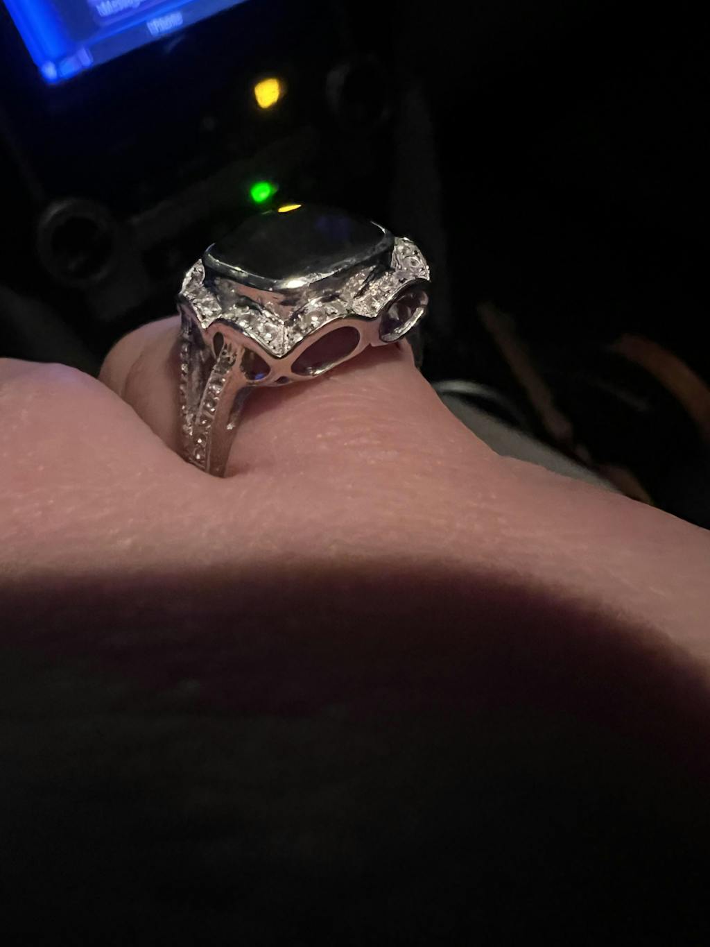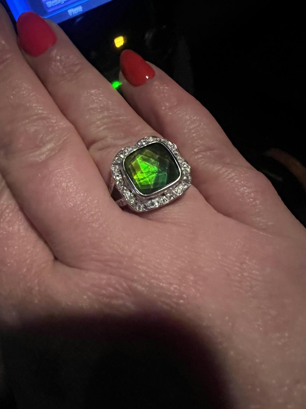 Standard grade 10mm x 10mm square ammolite ring set in sterling silver accented with white sapphire.