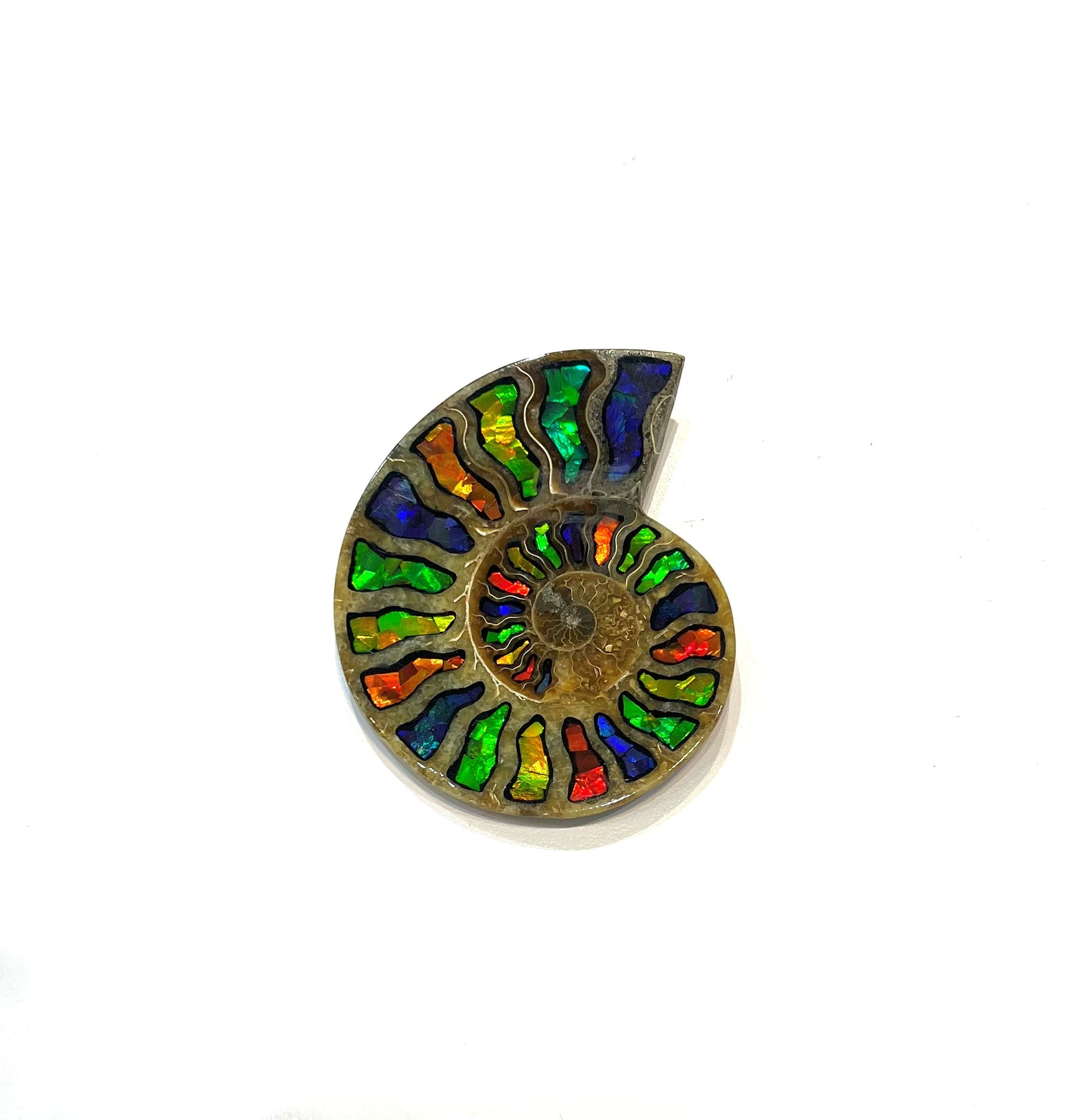 Discover the allure of hand-sculpted Ammonites, each inlaid with vibrant Canadian Ammolite and accented with exquisite Madagascar Ammolite shell. Every piece captures nature’s artistry, offering a unique pattern and color interplay—truly a one-of-a-kind treasure for discerning collectors or as a striking display piece.