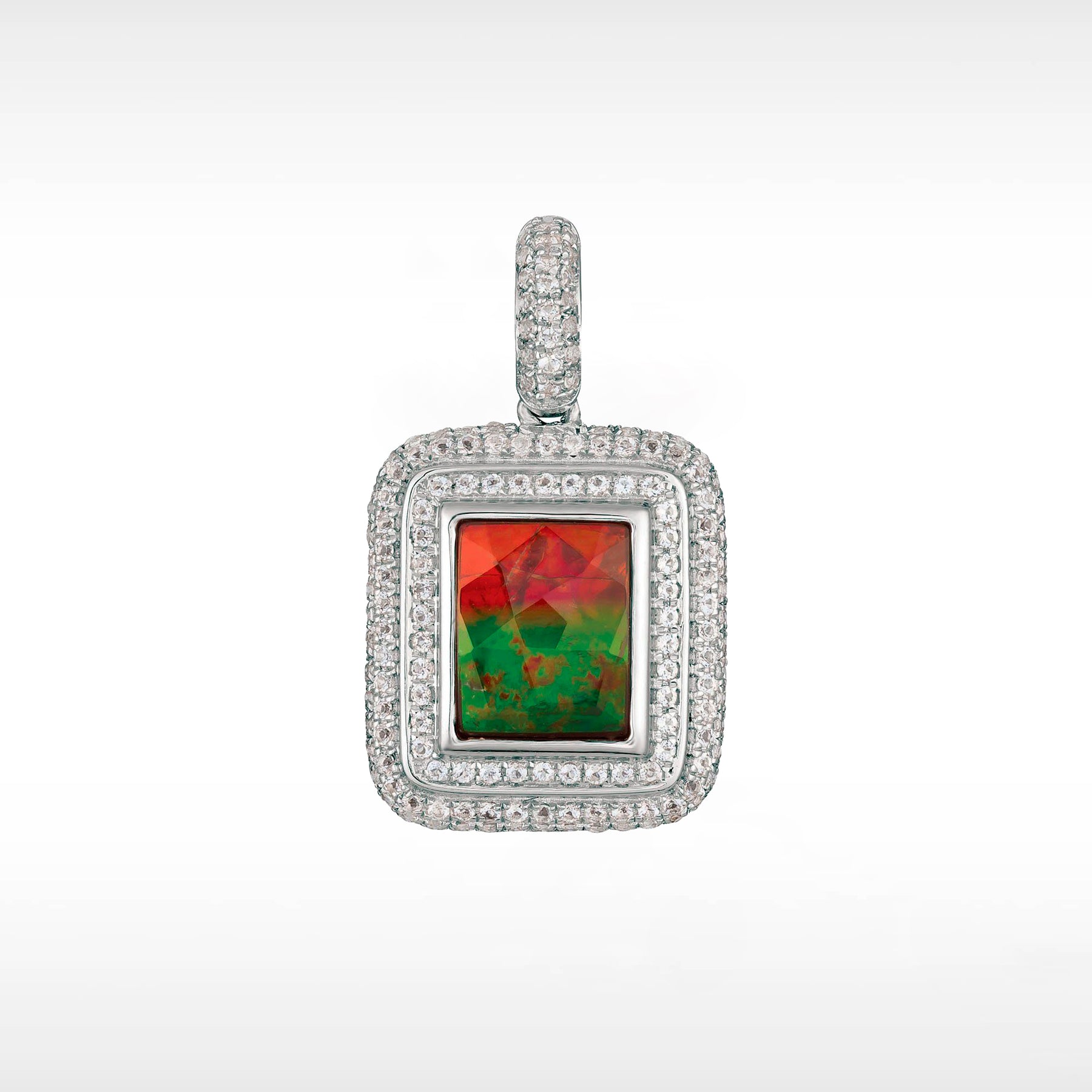Standard grade 10mm x 8mm rectangle Ammolite set in sterling silver accented with white topaz. Silver chain included.